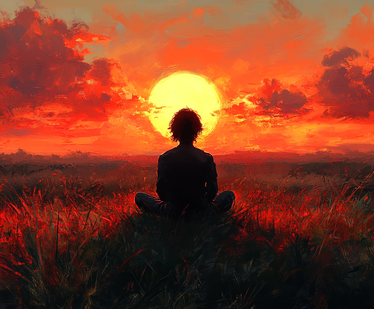 Der Himmel brennt in leuchtendem Gold und sanftem Purpur, während die Sonne sich wie ein stiller Kuss des Tages hinter den Horizont neigt und eine Welt in zarter, magischer Stille zurücklässt.